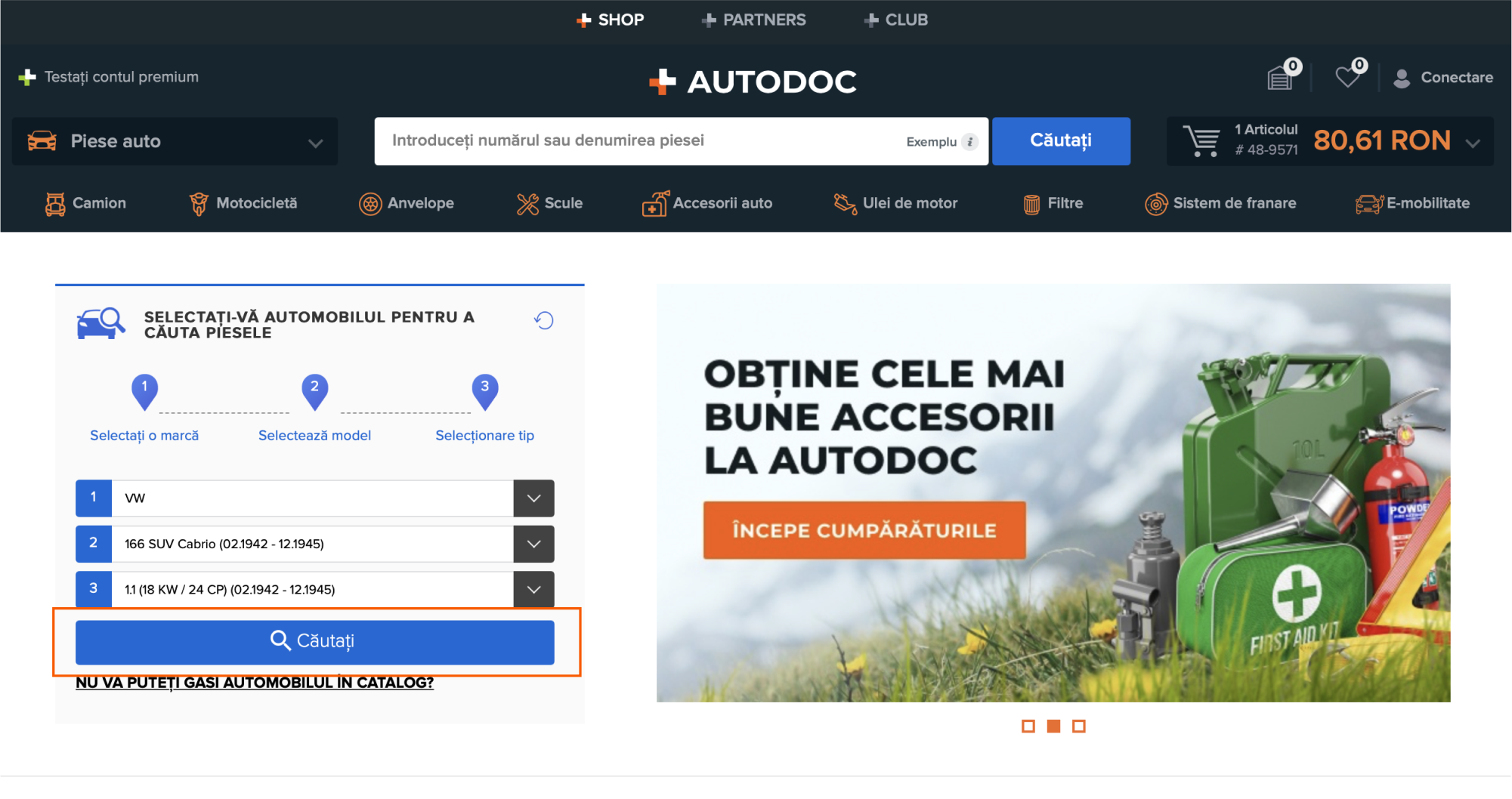 După ce ți-ai introdus cererea în bara de căutare, vor fi afișate rezultatele relevante ale produsului. Dacă nu ai introdus datele autovehiculului tău, poți verifica compatibilitatea unei anumite piese cu acel autovehicul pe fiecare pagină de produs.