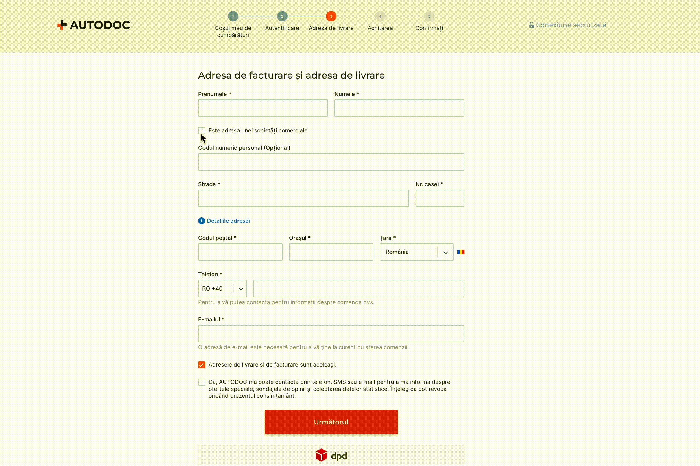 Ar trebui să-ți reverifici întotdeauna adresa înainte de efectuarea vreunei achiziții. Adresa de livrare poate fi modificată în a doua etapă a procesului de plasare a comenzii. Poți verifica celelalte adrese, inclusiv cele de facturare și de livrare, în secțiunea „Agenda mea” din contul tău.